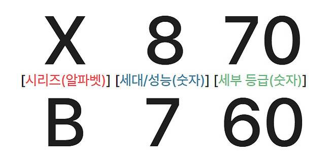 본격적으로 시작하기에 앞서 메인보드 칩셋 넘버링의 가장 큰 전제를 숙지하고 넘어가자. 메인보드 칩셋 넘버링은 [시리즈(알파벳)] + [세대/성능(숫자)] + [세부 등급(숫자)]로 이루어진다.