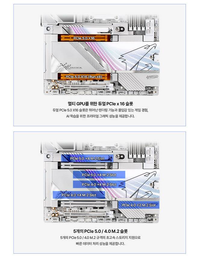더불어 확장성과 대역폭의 차이 역시 메인보드 등급을 가르는 중요한 요소다. 그래픽카드나 M.2 SSD를 연결하는 PCIe 인터페이스의 최신 버전은 5.0으로, 이전 세대인 Gen4 대비 최대 두 배 빠른 속도를 자랑한다. 당연히 고급형 메인보드는 PCIe 5.0을 지원하지만, 보급형 제품은 여전히 4.0 이하로 제한된 경우가 많다. 예를 들어, 사진 속 기가바이트 X870E 메인보드의 슬롯은 PCIe 5.0 규격을 지원한다. 다만 그래픽카드 슬롯이 여러 개인 경우, 일반적으로 맨 위 슬롯이 PCIe 5.0 x16 레인, 아래쪽 슬롯이 PCIe 5.0 x8 레인으로 작동하므로 그래픽카드는 가능한 한 최상단 슬롯에 장착하는 것이 좋다.