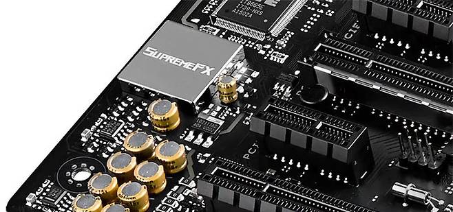 사운드 칩셋 역시 메인보드 등급을 가르는 숨은 요소 중 하나다. 예전에는 별도의 사운드 카드를 장착해야 고음질 출력을 기대할 수 있었지만, 사운드 칩셋이 메인보드에 온보드(내장) 형태로 통합되면서 그 중요성이 점점 줄어들었다. 게다가 음향에 민감한 사용자층이 한정되어 있어, 점차 마니아적인 영역으로 분류되기도 했다. 그러나 고급형 메인보드에서는 여전히 이 부분까지 세심하게 설계한다. 저가형 리얼텍(Realtek) 칩셋 대신, 최대 32비트 / 384kHz 고해상도 오디오를 지원하는 SupremeFX나 ESS Sabre(ES 계열) 칩셋을 탑재해, 게임·영화 감상·음악 재생 등 멀티미디어 환경에서 뚜렷한 사운드 차이를 만들어낸다. 개인적으로는 확실히 추천하는 기능이지만, 리얼텍 저가형 사운드 칩셋도 어느 정도 소리를 내는데에는 부족함이 없다.
