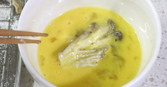 밀가루를 묻힌 느타리버섯을 계란물에 적셔주세요.
