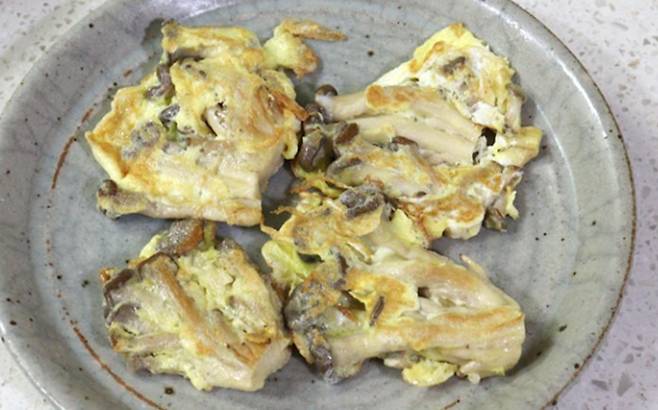 달궈진 프라이팬에 기름을 두르고 느타리버섯을 노릇하게 구워내면 고소한 느타리버섯전 완성입니다.