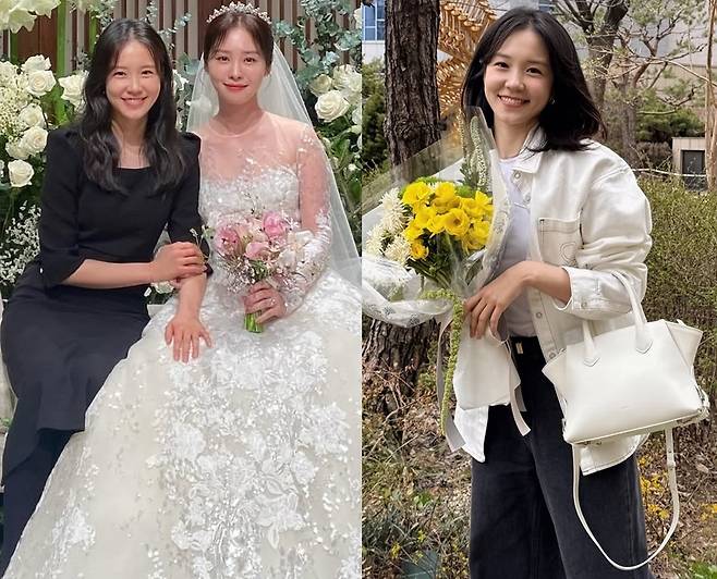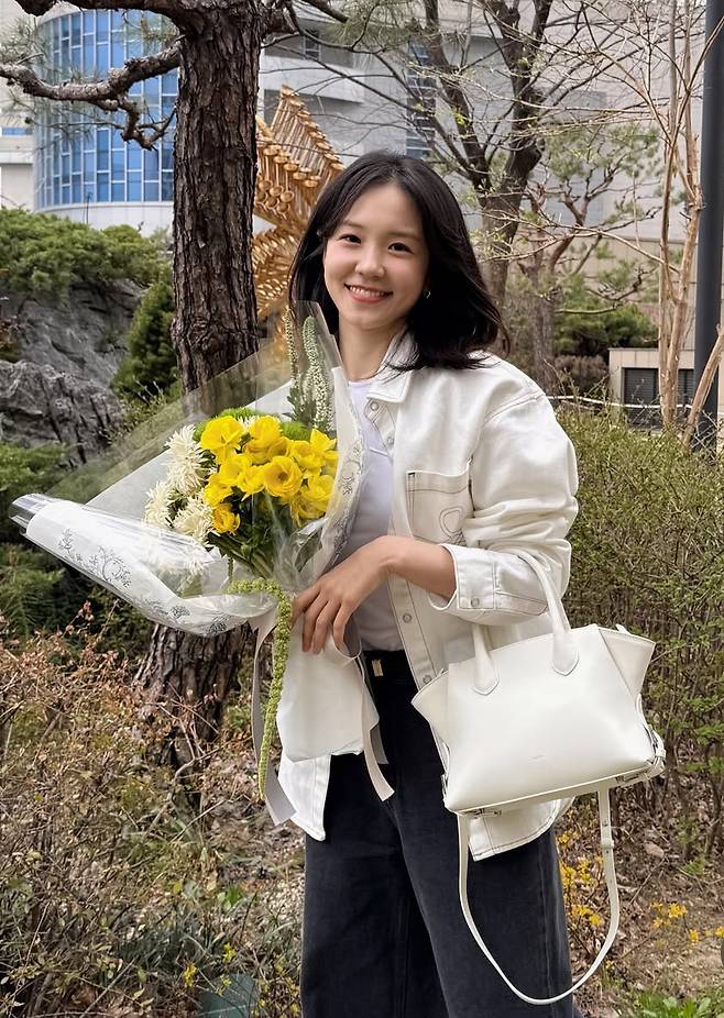 아이보리색 토트백과 밝은 꽃다발이 전체적인 룩에 생기를 더했습니다.