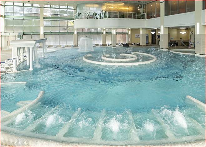 수치료와 마사지로 일깨우는 신체의 활력 2006년 국내 최초로 도입된 독일식 바데풀은 직경 30m, 수심 1.2m라는 세계적인 규모를 자랑합니다. 단순한 온탕 이용을 넘어 물속에서 보행하거나 수영을 하며 운동할 수 있도록 설계되었으며, 내부에 장치된 워터 제트 분사는 신체 각 부위를 자극해 안마 효과를 선사합니다. 10여 종의 수치료 시설과 유수풀, 유아풀, 사우나가 마련된 실내 바데풀은 남녀노소 모두에게 건강 증진의 낙원이 되어줍니다.
