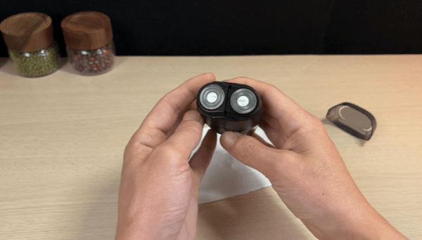 면도기 헤드를 분리하고 미지근한 물로 가볍게 헹굽니다.