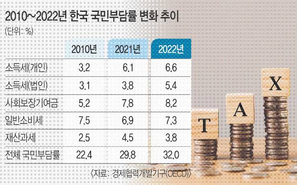 17일 OECD가 공개한 '2023년 세입 통계'에 따르면 한국의 국민부담률은 2010년 22.4%에서 2022년 32.0%로 12년 사이 9.6% 포인트 올랐다.