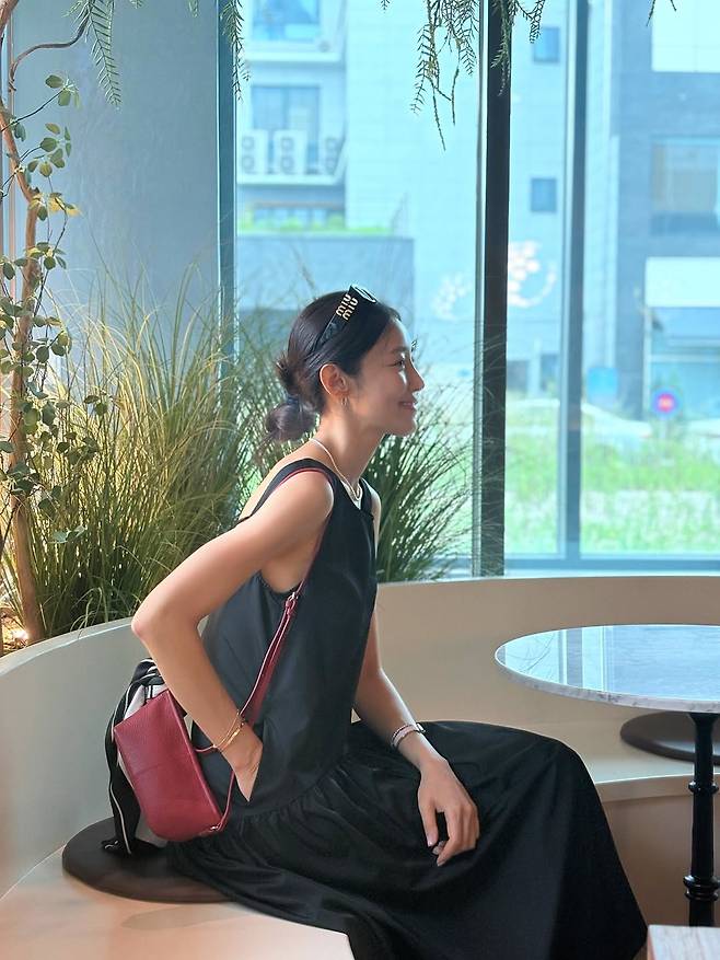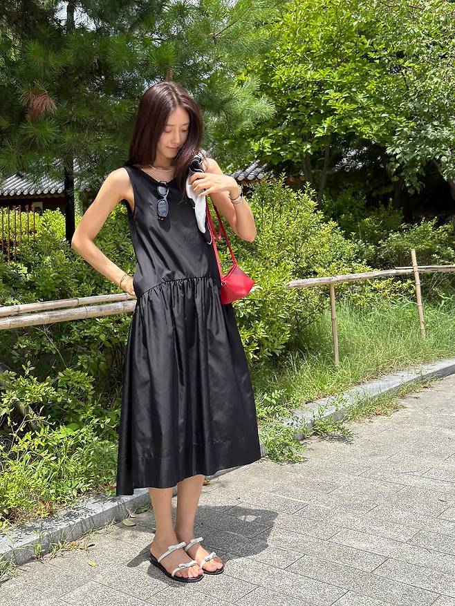 검은 민소매 롱 원피스가 자연을 배경 삼아 한 폭의 수채화처럼 어우러지고, 작고 선명한 레드 미니백이 포인트가 되어 그녀만의 우아함을 더합니다.
