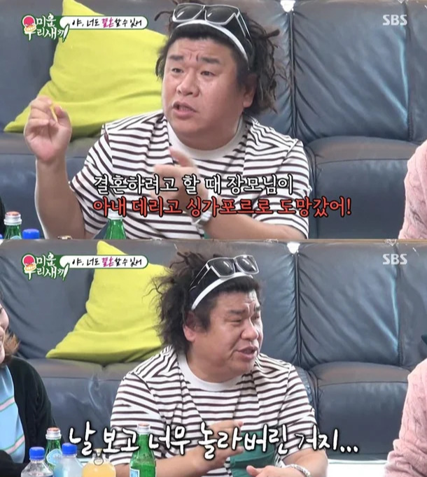 존재도 몰랐던 예비사위의 엄청난 비주얼을 보고 무척 놀라고 말았던 것. 그 길로 장모님은 딸의 결혼을 막기 위해 그의 아내를 데리고 싱가포르로 도망가버렸다고 한다. 더 이상 자신이 나선다고 해결될 일이 아니라고 생각한 오정태.