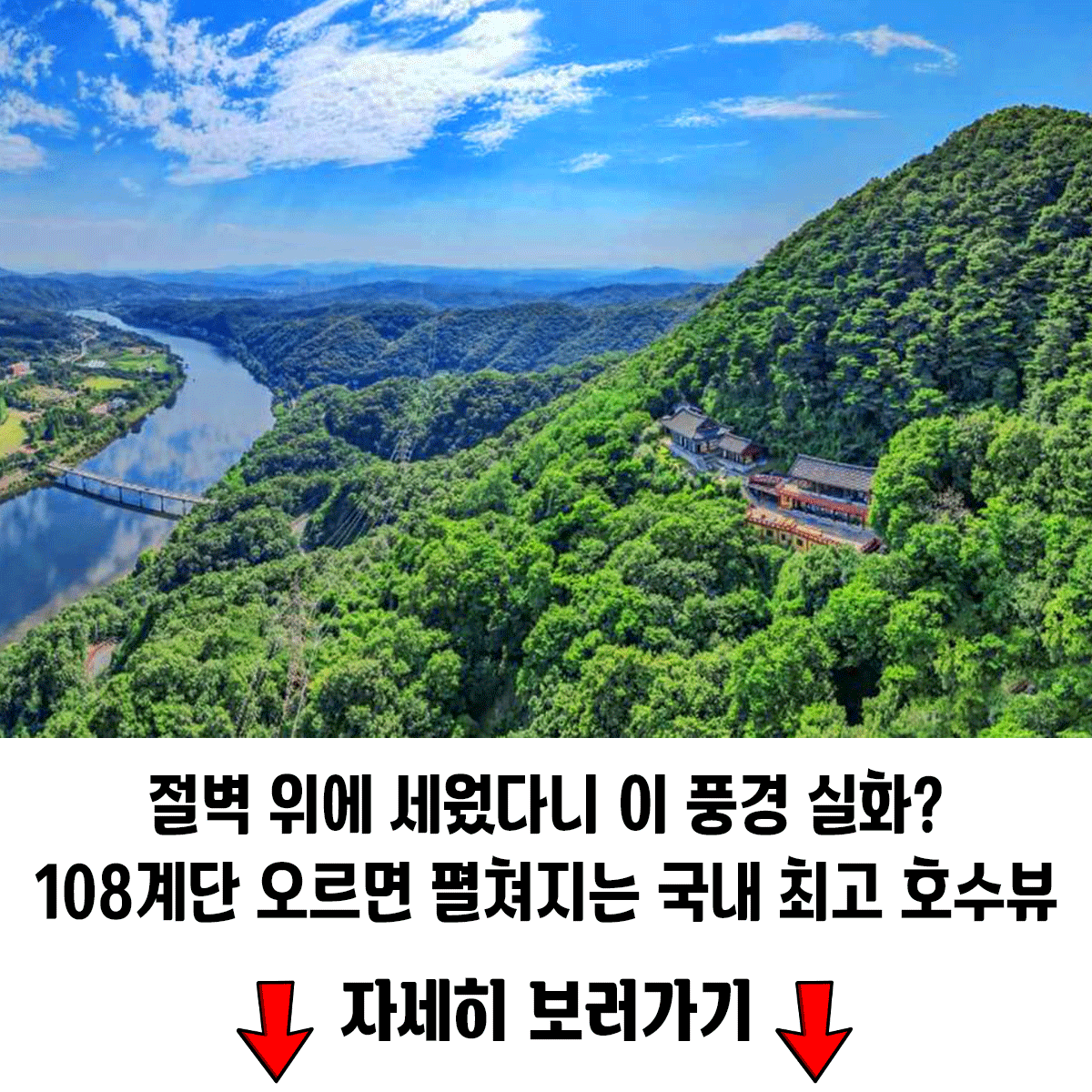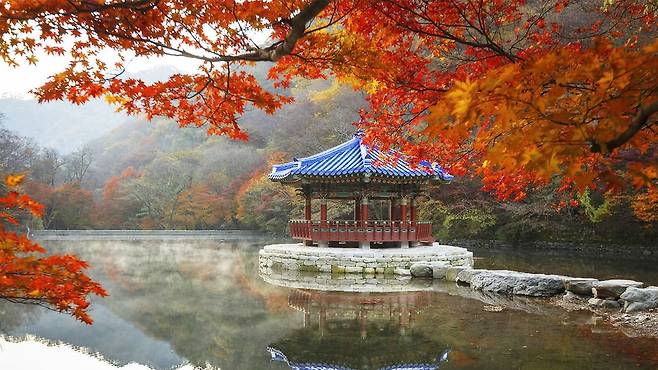병풍처럼 둘러싼 봉우리들과 울긋불긋 물든 숲길, 그리고 고요한 산사가 조화를 이뤄 압도적인 풍경 완성