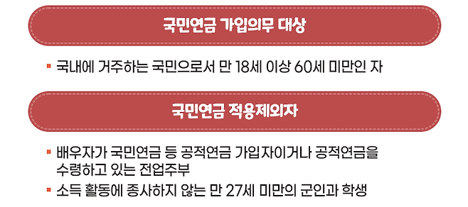 다만 배우자가 국민연금 등 공적연금 가입자이거나 공적연금을 수령하고 있는 전업주부는 의무가입 대상에서 제외됩니다. 그리고 소득 활동에 종사하지 않는 만27세 미만의 군인과 학생도 의무가입 대상에서 빠집니다. 이들을 국민연금 적용제외자라고 합니다.