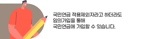 하지만 의무가입 대상이 아니라고 국민연금에 가입할 수 없는 것은 아닙니다. 만 60세가 되기 전에 본인이 신청하면 국민연금에 가입할 수 있는데, 이렇게 스스로 국민연금에 가입하는 것을 ‘임의가입’이라고 합니다.