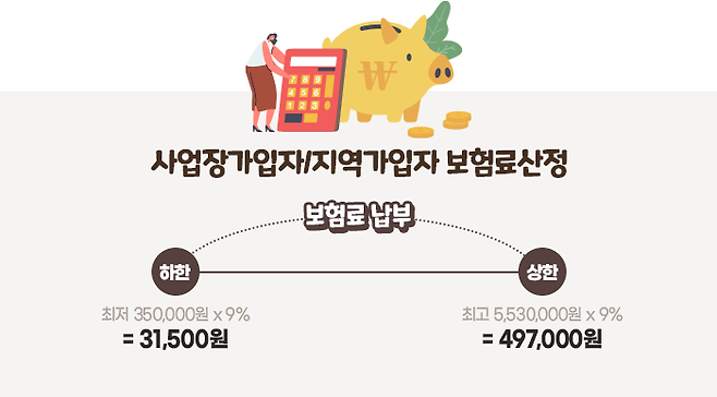 따라서 신고한 기준소득월액이 350,000원보다 적은 경우에는 350,000원을 기준소득월액으로 하고, 5,530,000원보다 많으면 5,530,000원을 기준소득월액으로 합니다. 여기에 보험료율 9%를 적용하면 사업장가입자와 지역가입자는 31,500원에서 497,700원 사이의 보험료를 납부하게 됩니다.