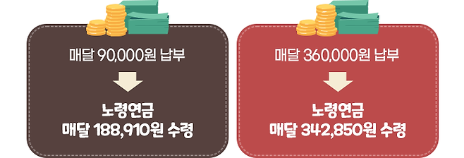 매달 보험료로 90,000원씩 10년간 보험료를 납부하면 노령연금으로 매달 188,910원을 수령할 수 있습니다. 그런데 매달 보험료로 360,000원씩 10년간 납부하면 노령연금으로 월 342,850원을 수령할 수 있습니다. 보험료는 4배인데 연금 수령액은 채 2배가 안 됩니다.