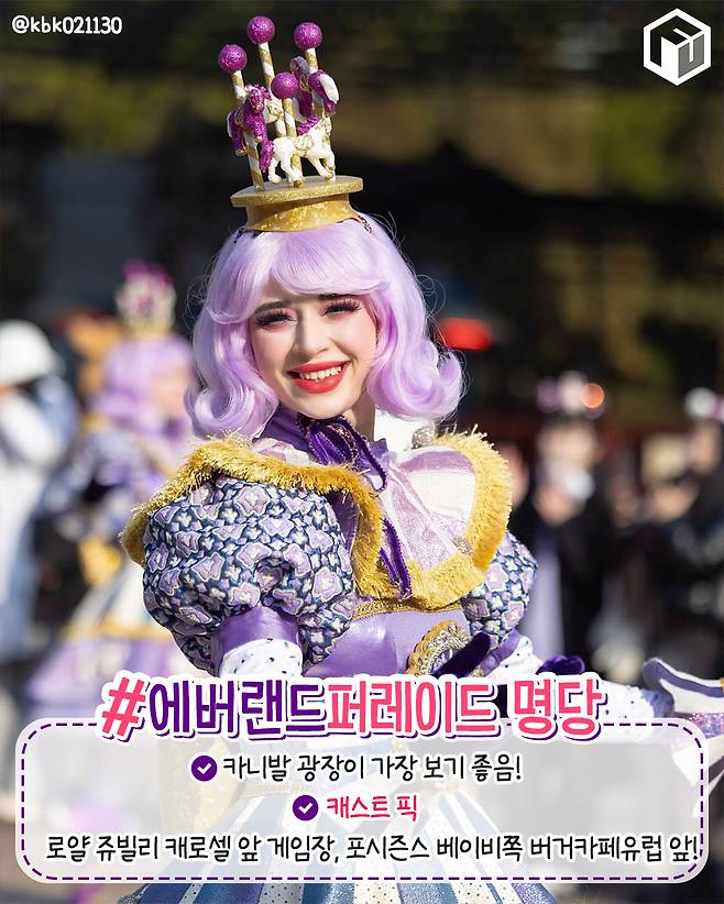 에버랜드 캐스트가 추천하는 퍼레이드 명당은 '로얄 쥬빌리 캐로셀 앞 게임장 근처'와 '포시즌스 베이비' 근처의 버거카페유럽 앞입니다. 물론 편하게 감상하고 싶다면 카니발 광장이 가장 좋은 에버랜드 퍼레이드 명당이죠.