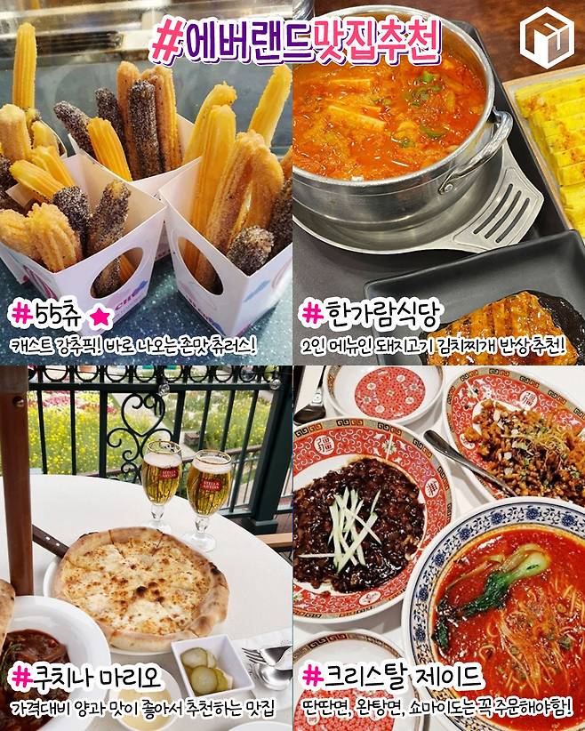 에버랜드 내 식당과 먹거리의 가격은 평균적으로 높은 편입니다. 맛과 양은 가격 대비 평이 좋지 않은 편인데요. 그중에서도 에버랜드 캐스트가 추천하는 맛집 3곳을 소개합니다.