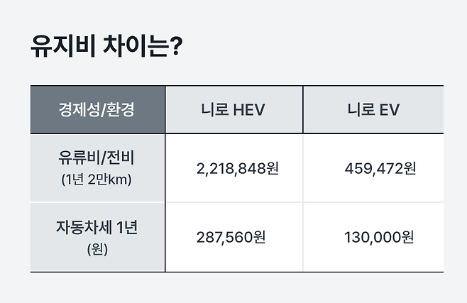 전기차와 하이브리드차의 유류비/전비를 기아의 '니로' 모델로 비교해 보면 연간 2만km를 주행할 경우 전기차 모델이 약 170만원 정도를 절약할 수 있어요. 이는 평균치를 기준으로 계산한 값으로 주행거리, 주행습관, 급속/완속 충전 여부에 따라 유지비가 달라질 수 있어요. 자동차세도 1년 기준 전기차 모델이 15만원 정도가 저렴합니다.