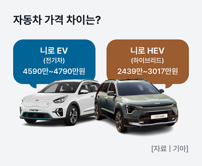 반면 하이브리드차는 같은 모델일 경우 내연기관 차에 비해 조금 더 가격이 나가는 수준으로 전기차 대비 출고가가 상당히 저렴한 편이죠.