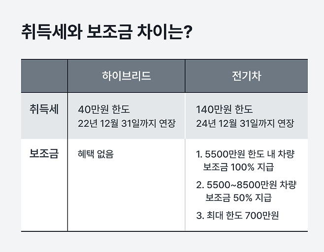 반면에 하이브리드차는 보조금은 없고 2022년 12월 31일까지 40만원 한도 내에서 취득세를 감면받을 수 있습니다.