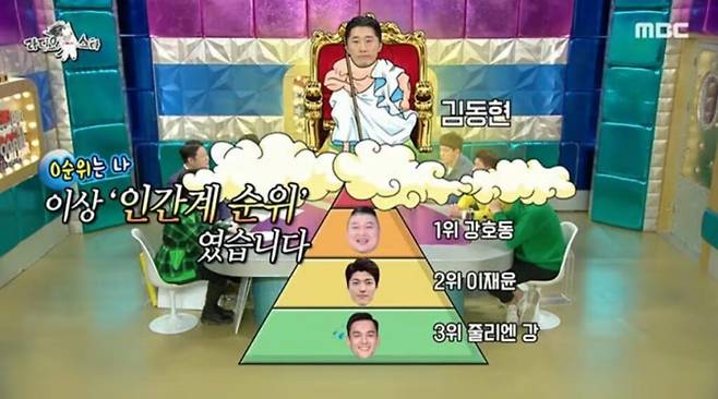 김동현은 MBC 예능 프로그램 ‘라디오스타’에 출연해 줄리엔 강이 꼽은 연예계 싸움 서열을 언급하며 새로운 순위를 제시했다. 그가 뽑은 1위는 씨름 천하장사 출신의 강호동.