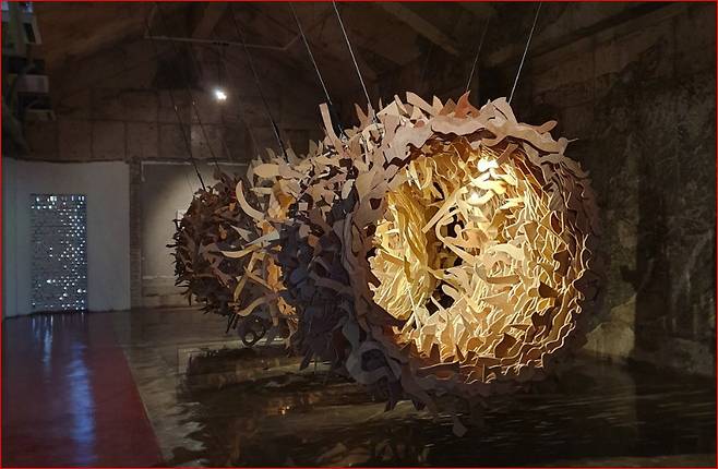 별똥별이 떨어지는 순간을 형상화한 듯, 나무 파편들을 원으로 엮어 빛과 회전의 우주적 에너지를 표현했습니다. 작가가 평생 품어온 ‘우주에 대한 사유’를 오롯이 담은 공간이지요.