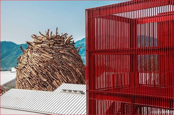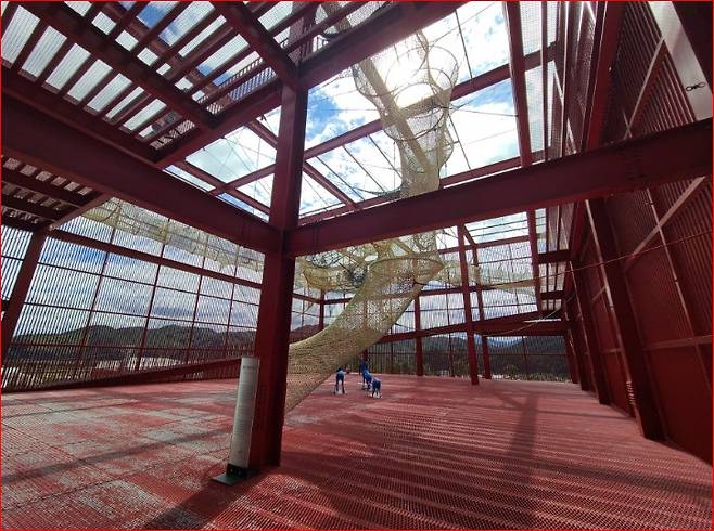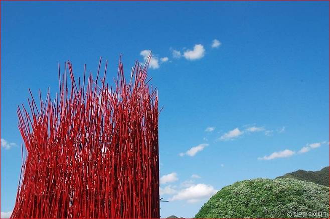 젊은달 와이파크의 입구에 들어서면 가장 먼저 시선을 압도하는 것은 붉은 대나무 숲입니다. 금속 파이프를 활용해 만든 설치미술 작품으로, 영월의 푸른 자연과 대비되는 붉은 기운이 강렬하게 다가옵니다. 마치 우주의 기운이 응집된 듯한 이 공간은 작가가 말한 “붉은 에너지의 우주”를 가장 잘 보여주는 상징적인 장소입니다.