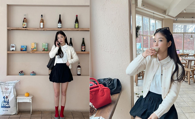사진 속 기은세는 흰 블라우스를 이너로 입고 아이보리 가디건과 블랙 플레어 미니스커트를 입었다. 빨간 양말과 플래슈즈를 신어 포인트를 선보이며 남다른 패션감각을 자랑했다.