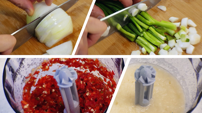 배는 갈아서 사용하고, 홍고추와 청양고추 모두 갈아 주세요. 홍고추 씨도 함께 넣어 갈아주세요. 그래야 매콤함이 살아나요.