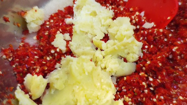저는 풀을 사용하는 대신 으깬 감자를 이용했는데요. 으깬 감자를 넣으면 풋내도 잡고, 아삭함도 오래 유지할 수 있어요.