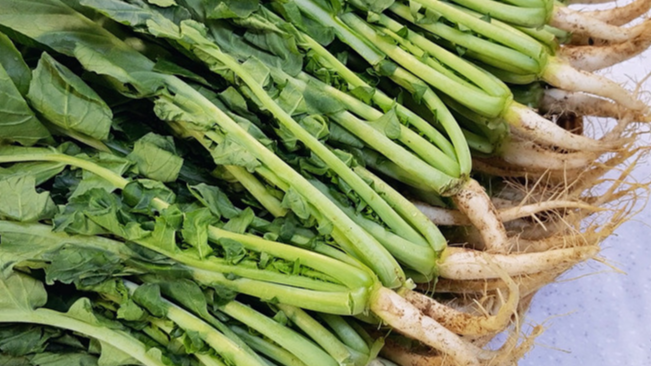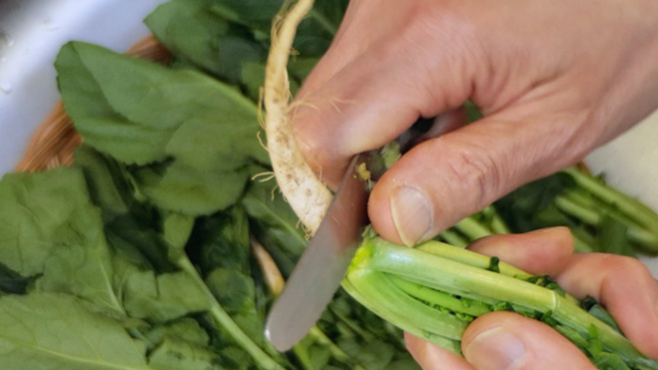 가장 먼저 해야 할 일은 열무를 다듬는 일이에요. 무 부분을 잘 손질해야 하는데요. 꼭지 부분은 제거하고, 잔털을 제거해 주세요. 그리고 열무의 반을 자른 후 무 부분도 반을 갈라 주세요.