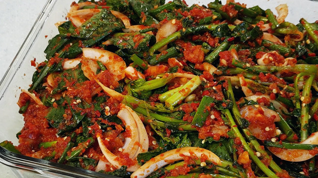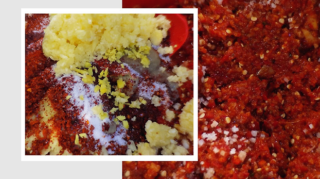 다진 마늘 4T, 쪽파 13개, 다진 생강 1/2T, 홍고추 20개, 청양고추 8개, 매실청 2T, 다시마 육수 3T, 고춧가루 3/4컵,