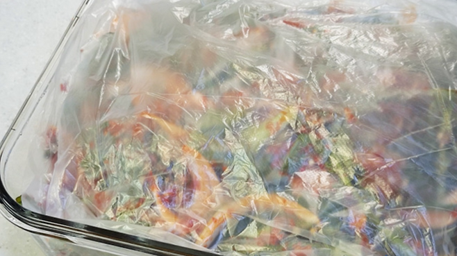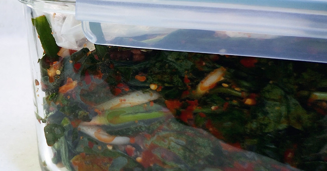 잘 버무려진 열무김치는 밀폐 용기에 담아 비닐로 위를 덮어 주세요.