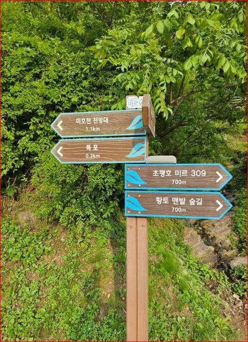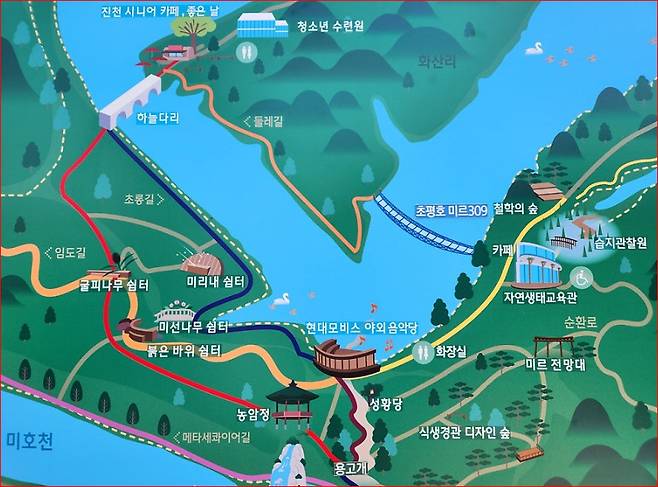 미르숲 입구 → 황토숲길 맨발 체험 → 초평호 미르309 출렁다리 왕복 → 초롱길 하늘다리 → 원점 회귀