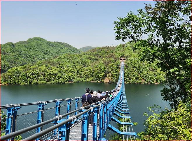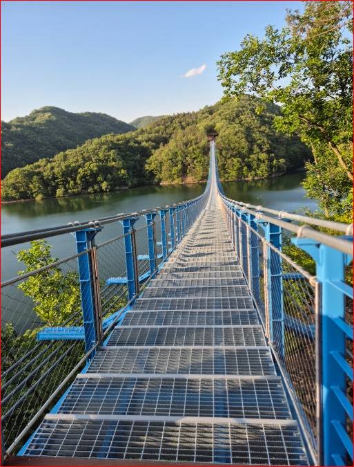 다리 위에서는 초평호의 맑은 물과 주변 숲의 푸르름,그리고 멀리 미르숲까지 한눈에 조망할 수 있어 사진 명소로도 큰 인기를 끌고 있어요.출렁다리 양쪽에는 초롱길, 하늘다리로 연결된 순환 산책로가 이어져 가볍게 트레킹을 즐기기에 제격입니다.맑은 날에는 호수 위를 걷는 듯한 부유감 있는 체험도 함께할 수 있죠.