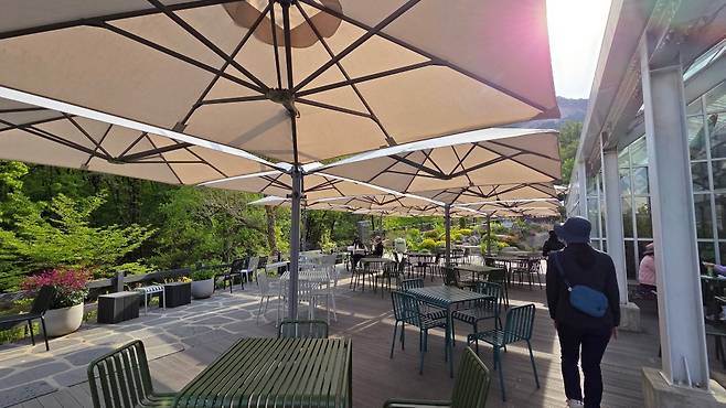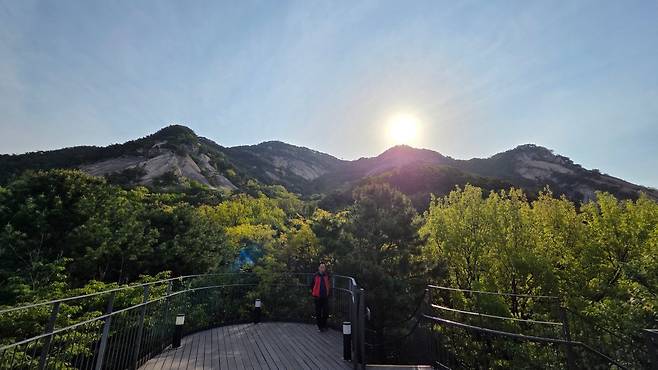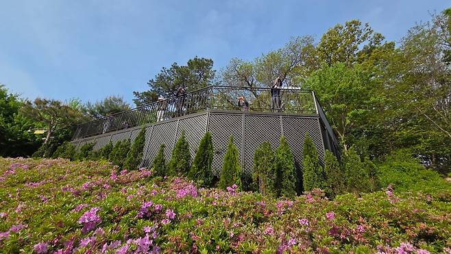 근처에 넓은 데크가 많아 쉬면서 준비한 간식도 먹고 잠시 쉬어갑니다. 이곳에 전망대가 있는데, 이 전망대에서 보는 뷰가 아주 좋습니다. 근처에 나비정원과 작은 카페도 있어 쉬어 가기 참 좋습니다. 철쭉 구경을 충분히 하고, 이제 다시 서울둘레길을 찾아 올라 상계 나들이 철쭉동산쪽으로 걸음을 옮깁니다.