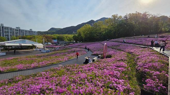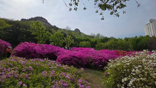 [리뷰타임스=곰돌이아빠 리뷰어] 요즈음은 전국 어디를 가도 꽃이 좋습니다. 봄의 전령사는 여러가지 꽃이 있지만, 산에서 만나는 꽃은 역시 진달래와 철쭉이 쌍벽을 이룹니다. 4월말이면 진달래는 지고, 철쭉이 그 자리를 이어받을 때입니다. 수도권에는 철쭉이 있는 곳이 몇 군데 있지만, 가장 유명한 곳은 군포와 노원입니다. 오늘은 점심 약속이 있어 가까운 노원으로 가보았습니다.