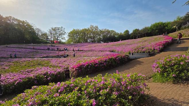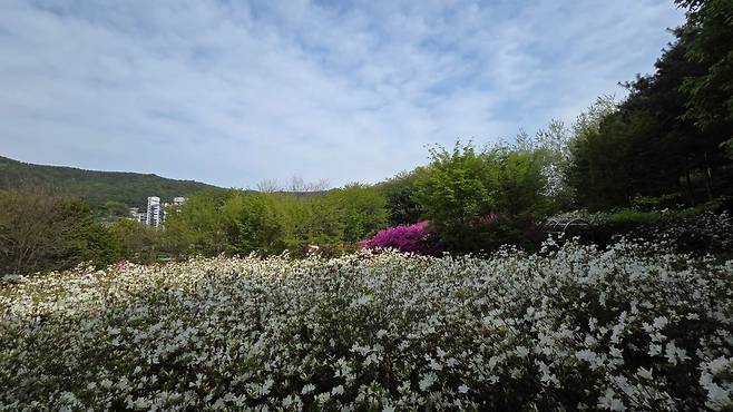 이곳이 상계 나들이 철쭉동산입니다. 여기는 대략 앞서 만났던 곳의 1/10 정도의 작은 규모지만 조용하게 철쭉을 만나기는 좋습니다. 흰 철쭉도 그렇고, 좀 더 화려하고 다양한 철쭉을 만날 수 있습니다. 아무래도 철쭉의 한 종류인 영산홍이 심어진 까닭이지 않나 싶네요.