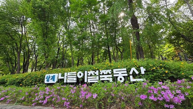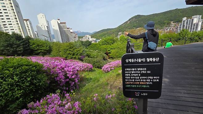 들머리를 어떻게 잡느냐에 따라 다르지만, 당고개역을 들머리로 잡는다면, 5분만 걸으면 상계나들이 철쭉동산이 펼쳐집니다. 이곳은 2005년 불법경작지 정비를 시작으로 3만 주가 넘는 백철쭉과 자산홍 등 다양한 철쭉을 심은 곳입니다. 매년 봄이면 하얗고 붉게 물든 철쭉이 장관을 이룹니다. 매년은 아니지만 봄이면 이곳을 제법 많이 찾곤 합니다. 지난 2021년에는 산책로와 전망대, 데크쉼터, 의자 등 편의시설이 확충되어 누구나 편하게 꽃길을 걸으며 즐길 수 있습니다. 지금의 이름인 나들이 철쭉동산이라는 이름은 주민 공모를 통해 정해졌다고 합니다.