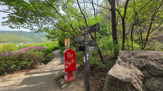여기서 조금 더 걸으면 두 번째 철쭉동산을 만납니다. 반가운 서울둘레길 스탬프 찍는 곳이네요. 코스가 조정되면서 위치가 바뀌었나 조금 달라진 것 같기도...