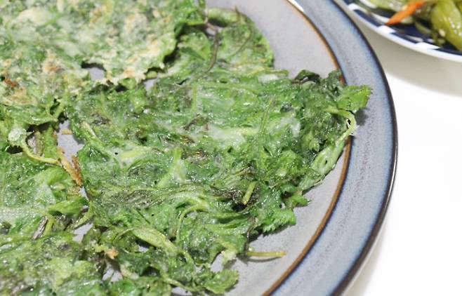 앞뒤로 노릇하게 구워지면 접시에 담아냅니다. 쑥 부침개 완성이에요.