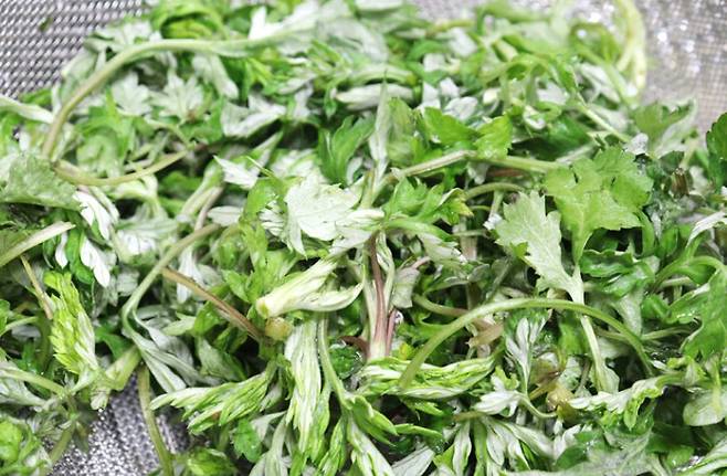 굵은 줄기는 제거하고 위쪽 여린 잎만 따서 남깁니다.