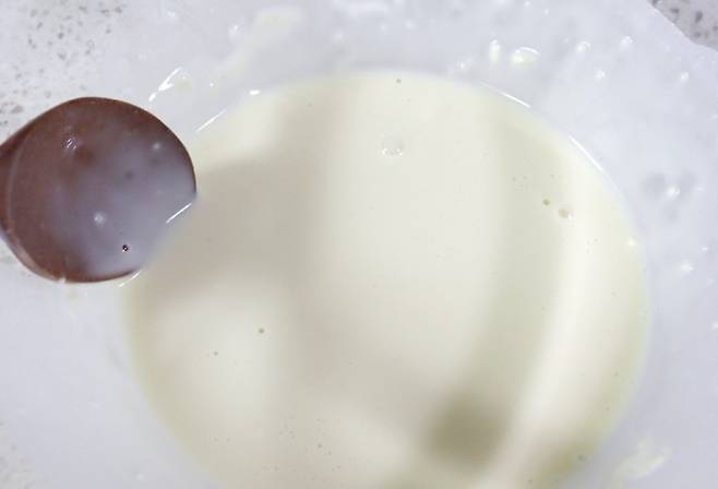 숟가락으로 반죽물을 떠 아래로 흘렸을 때 주루룩 흘러 두유 같다는 느낌이 들면 완성입니다.