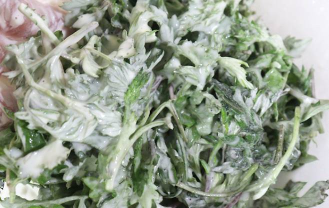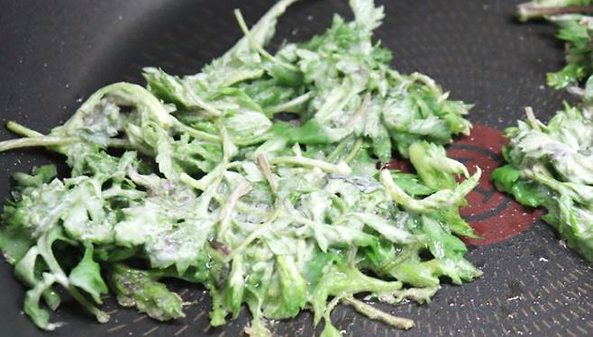 손질된 쑥에 반죽물을 붓습니다.