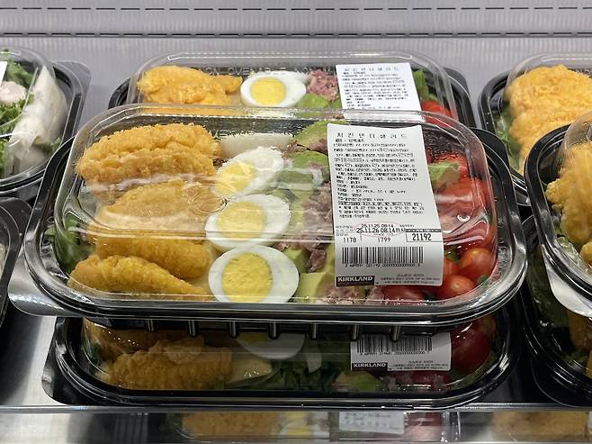 코스트코의 치킨텐더 샐러드는 바삭하게 튀겨진 치킨텐더가 듬뿍 올라가 있어 첫 입부터 잡내 없이 고소하고 튼실한 닭고기 식감이 돋보여요.