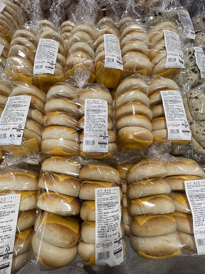 코스트코의 워터보일드 치즈 베이글은 반죽을 끓는 물에 데쳐 만든 방식으로 겉은 쫄깃하고 속은 폭신한 베이글 특유의 질감을 구현해요.