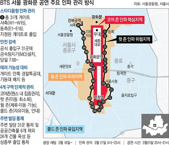 나흘 뒤인 21일 방탄소년단(BTS)의 컴백 공연 무대로 변신하는 서울 종로구 광화문광장은 17일 오전부터 사람들로 붐볐다. 광장 북단에서는 작업자 수십 명이 전날부터 공연장 가설 작업을 시작했다. 무대와 객석 설치에 앞서 곳곳에 펜스가 세워졌고, 공연 관계자와 경찰이 현장 출입을 통제했다.