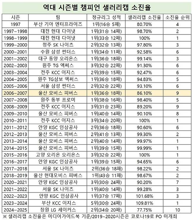 90% 미만 소진율 챔피언은 이외에도 2006~2007시즌 86.1%의 울산 모비스(현 현대모비스), 2008~2009시즌 89.2%의 전주 KCC(현 부산 KCC)가 있다.