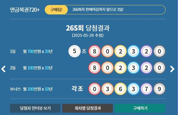 2025๋ 5์ 29์ผ, ๋๋์ด 265ํ ์ฐ๊ธ๋ณต๊ถ ๋น์ฒจ๋ฒํธ๊ฐ ๊ณต๊ฐ๋์์ต๋๋ค.