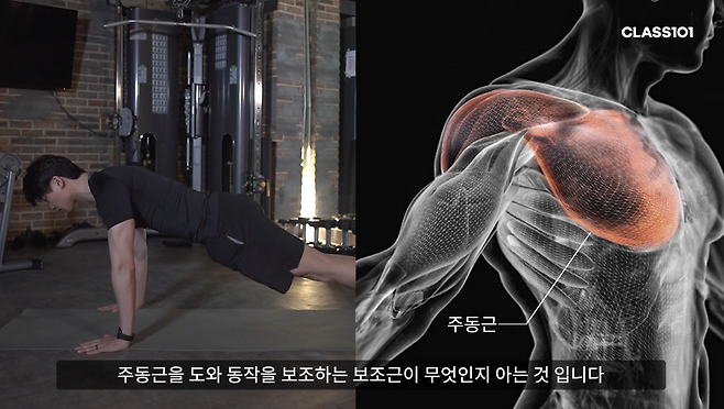 운동을 하기 전 꼭 알아야 하는 것은 이 운동을 할 때 주로 쓰이는 근육인 '주동근'과 주동근을 도와 동작을 보조하는 '보조근'이 무엇인지를 아는 거예요. 푸쉬업의 주동근은 가슴 근육(대흉근)이고 보조근은 어깨 앞쪽 근육(전면삼각근), 팔 뒤쪽 근육(삼두)입니다. 남자 팔 운동까지 끝낼 수 있는 좋은 운동이에요. 주동근인 가슴에 주로 힘이 들어가는 느낌으로 운동을 하면 됩니다.