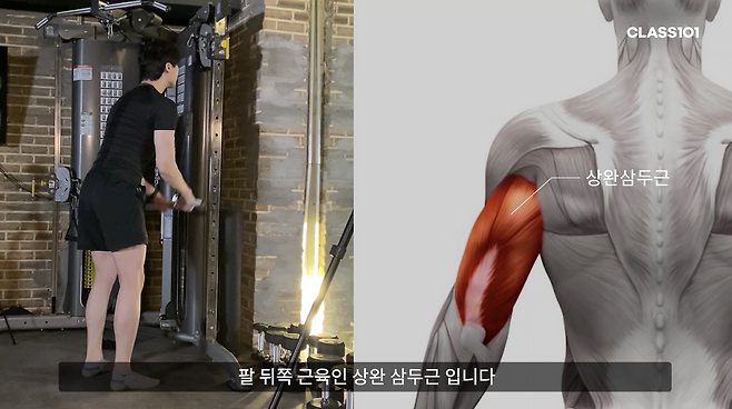 남자 팔 운동은 보통 덤벨 삼두 운동으로 진행하는데요. 예상 외로 남자 팔 운동을 할 때에는 덤벨 삼두 운동보다 케이블 머신이나 바벨을 이용하는 동작들이 많아요. 예를 들어 '케이블 푸쉬 다운'이라는 동작이 있는데요. 상완삼두근을 자극하는 동작이에요. 상완삼두근은 뒤쪽에 있는 팔 근육이고 3가지 근육으로 구성되어 있어요.