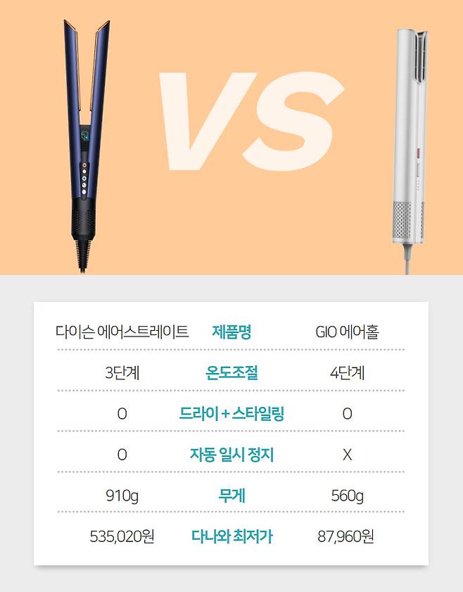 두 제품은 젖은 모발을 말리면서 스트레이트 스타일링까지 가능하다. 일반적인 고데기의 경우 제품을 작동하면 뜨거운 열이 발생하는 구조라 건조한 모발에서만 사용이 가능하지만 다이슨과 GIO 제품은 열이 아닌 바람으로 작동하는 방식이라 모발 건조 유무와 상관없이 사용할 수 있다. 참고로 고데기는 스트레이트, 에어브러시는 웨이브 스타일링에 적합하다는 차이가 있다. 온도를 균일하게 유지해 모발 손상을 막아주는 열 제어 시스템은 두 제품 모두 들어갔다.