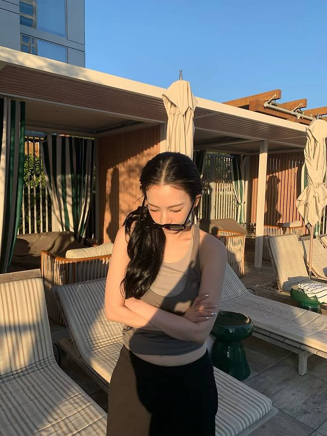 머리에 올린 선글라스와 길게 묶은 흑발 포니테일이 청량한 분위기를 더해준다.